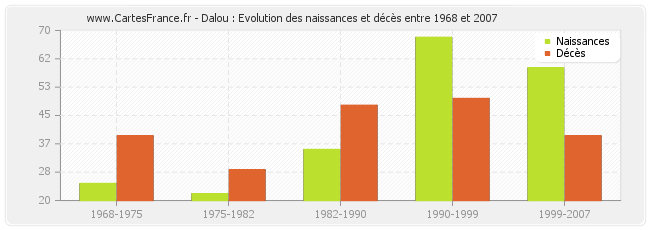 Dalou : évolution des naissances et décès de 1968 à 2007