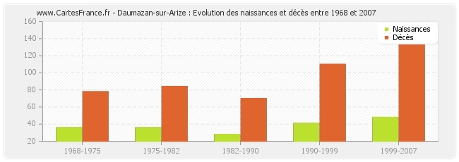 Daumazan-sur-Arize : évolution des naissances et décès de 1968 à 2007