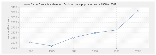 La population de Mazères était de 3 287 habitants en 2007, 2 618 habitants en 1999, 2 519 habitants en 1990, 2 355 habitants en 1982, 2 071 habitants en 1975 et 2 192 habitants en 1968.