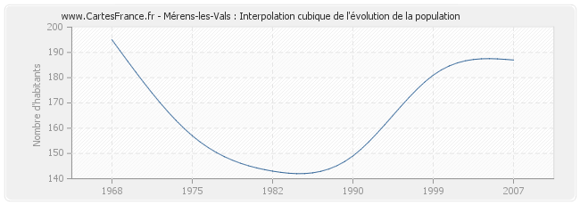 Cette courbe reprend l'historique de la population de Mérens-les-Vals de 1968 à 2007 en interpolation cubique. Ceci permet d'obtenir plus précisément la population de la commune de Mérens-les-Vals les années ou aucun recensement n'a été effectué.