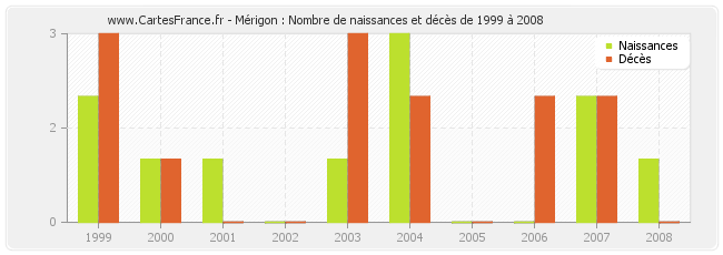 - Mérigon en 2008 : 1 naissances et 0 décès