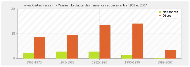Mijanès : évolution des naissances et décès de 1968 à 2007