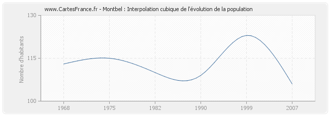 Cette courbe reprend l'historique de la population de Montbel de 1968 à 2007 en interpolation cubique. Ceci permet d'obtenir plus précisément la population de la commune de Montbel les années ou aucun recensement n'a été effectué.