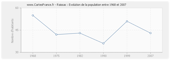 La population de Raissac était de 43 habitants en 2007, 51 habitants en 1999, 36 habitants en 1990, 43 habitants en 1982, 42 habitants en 1975 et 55 habitants en 1968.