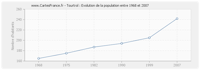 La population de Tourtrol était de 242 habitants en 2007, 205 habitants en 1999, 194 habitants en 1990, 187 habitants en 1982, 175 habitants en 1975 et 165 habitants en 1968.