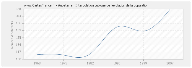 Cette courbe reprend l'historique de la population d'Aubeterre de 1968 à 2007 en interpolation cubique. Ceci permet d'obtenir plus précisément la population de la commune d'Aubeterre les années ou aucun recensement n'a été effectué.