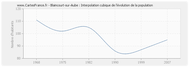 Cette courbe reprend l'historique de la population de Blaincourt-sur-Aube de 1968 à 2007 en interpolation cubique. Ceci permet d'obtenir plus précisément la population de la commune de Blaincourt-sur-Aube les années ou aucun recensement n'a été effectué.