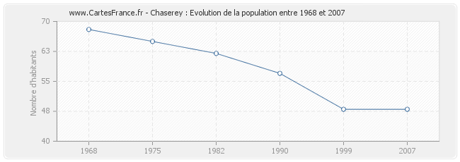 La population de Chaserey était de 48 habitants en 2007, 48 habitants en 1999, 57 habitants en 1990, 62 habitants en 1982, 65 habitants en 1975 et 68 habitants en 1968.