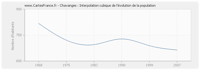 Cette courbe reprend l'historique de la population de Chavanges de 1968 à 2007 en interpolation cubique. Ceci permet d'obtenir plus précisément la population de la commune de Chavanges les années ou aucun recensement n'a été effectué.