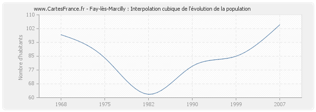 Cette courbe reprend l'historique de la population de Fay-lès-Marcilly de 1968 à 2007 en interpolation cubique. Ceci permet d'obtenir plus précisément la population de la commune de Fay-lès-Marcilly les années ou aucun recensement n'a été effectué.