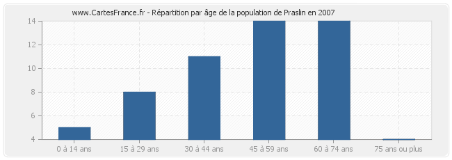 - Population de Praslin de 60 à 74 ans : 14 habitants