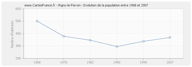 La population de Rigny-le-Ferron était de 369 habitants en 2007, 338 habitants en 1999, 296 habitants en 1990, 347 habitants en 1982, 379 habitants en 1975 et 501 habitants en 1968.