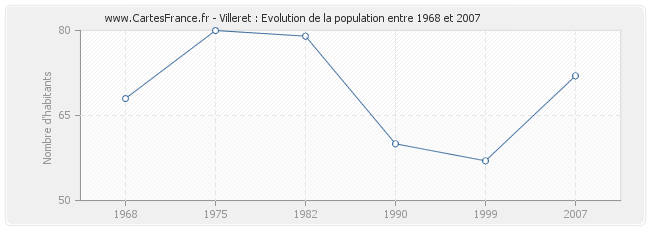 La population de Villeret était de 72 habitants en 2007, 57 habitants en 1999, 60 habitants en 1990, 79 habitants en 1982, 80 habitants en 1975 et 68 habitants en 1968.