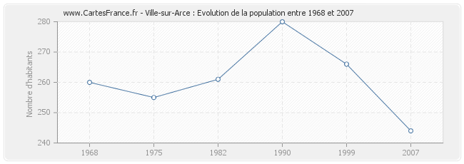 La population de Ville-sur-Arce était de 244 habitants en 2007, 266 habitants en 1999, 280 habitants en 1990, 261 habitants en 1982, 255 habitants en 1975 et 260 habitants en 1968.