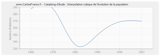 Cette courbe reprend l'historique de la population de Camplong-d'Aude de 1968 à 2007 en interpolation cubique. Ceci permet d'obtenir plus précisément la population de la commune de Camplong-d'Aude les années ou aucun recensement n'a été effectué.
