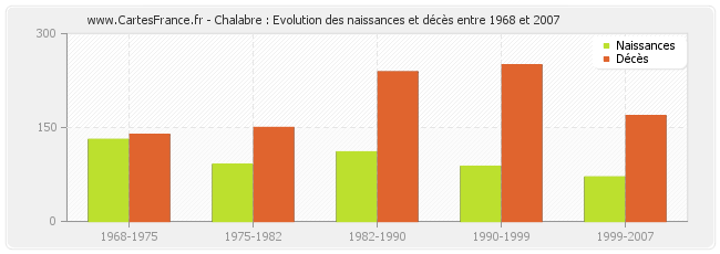 Chalabre : évolution des naissances et décès de 1968 à 2007
