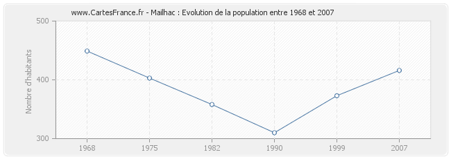 La population de Mailhac était de 416 habitants en 2007, 373 habitants en 1999, 310 habitants en 1990, 358 habitants en 1982, 403 habitants en 1975 et 449 habitants en 1968.