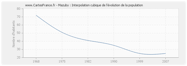 Cette courbe reprend l'historique de la population de Mazuby de 1968 à 2007 en interpolation cubique. Ceci permet d'obtenir plus précisément la population de la commune de Mazuby les années ou aucun recensement n'a été effectué.