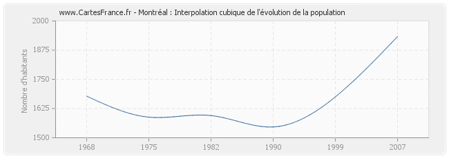 Cette courbe reprend l'historique de la population de Montréal de 1968 à 2007 en interpolation cubique. Ceci permet d'obtenir plus précisément la population de la commune de Montréal les années ou aucun recensement n'a été effectué.