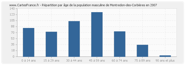 Répartition de la population masculine de Montredon-des-Corbières par âge en 2007 :