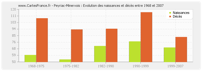 Peyriac-Minervois : évolution des naissances et décès de 1968 à 2007