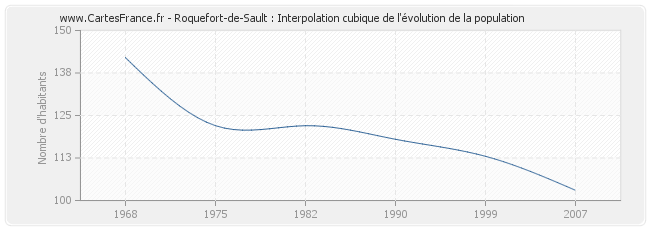 Cette courbe reprend l'historique de la population de Roquefort-de-Sault de 1968 à 2007 en interpolation cubique. Ceci permet d'obtenir plus précisément la population de la commune de Roquefort-de-Sault les années ou aucun recensement n'a été effectué.