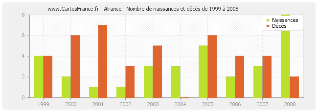 Alrance : évolution des naissances et décès de 1968 à 2007