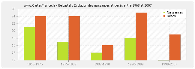 Belcastel : évolution des naissances et décès de 1968 à 2007