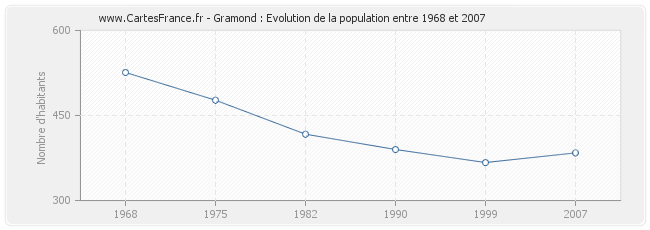 Cette courbe reprend l'historique de la population de Gramond de 1968 à 2007 en interpolation cubique. Ceci permet d'obtenir plus précisément la population de la commune de Gramond les années ou aucun recensement n'a été effectué.
