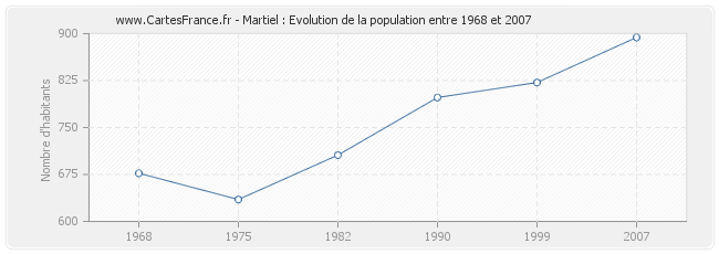 La population de Martiel était de 894 habitants en 2007, 822 habitants en 1999, 798 habitants en 1990, 706 habitants en 1982, 635 habitants en 1975 et 677 habitants en 1968.