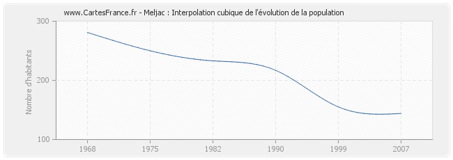 Cette courbe reprend l'historique de la population de Meljac de 1968 à 2007 en interpolation cubique. Ceci permet d'obtenir plus précisément la population de la commune de Meljac les années ou aucun recensement n'a été effectué.