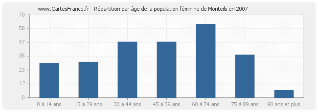 Répartition de la population féminine de Monteils par âge en 2007 :