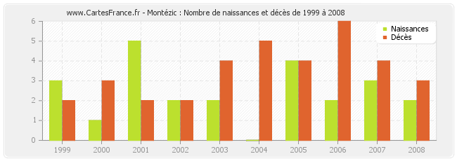 Montézic : évolution des naissances et décès de 1968 à 2007