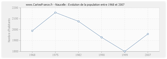 La population de Naucelle était de 1 960 habitants en 2007, 1 800 habitants en 1999, 1 929 habitants en 1990, 2 076 habitants en 1982, 2 157 habitants en 1975 et 1 989 habitants en 1968.