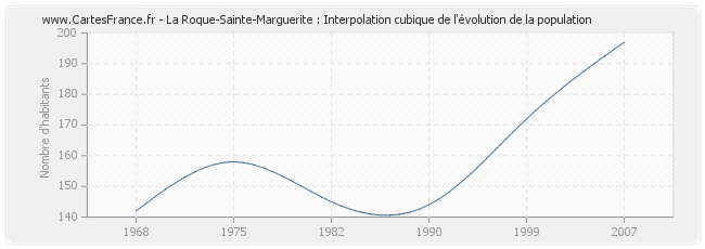 Cette courbe reprend l'historique de la population de La Roque-Sainte-Marguerite de 1968 à 2007 en interpolation cubique. Ceci permet d'obtenir plus précisément la population de la commune de La Roque-Sainte-Marguerite les années ou aucun recensement n'a été effectué.