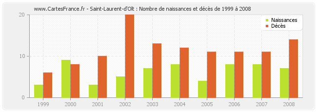 - Saint-Laurent-d'Olt en 2008 : 7 naissances et 14 décès