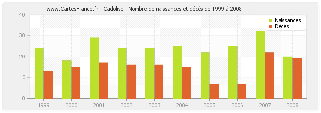 - Cadolive en 2007 : 32 naissances et 22 décès