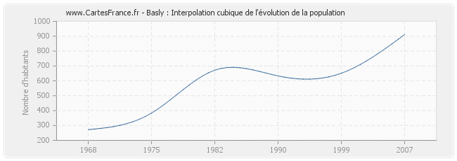 Cette courbe reprend l'historique de la population de Basly de 1968 à 2007 en interpolation cubique. Ceci permet d'obtenir plus précisément la population de la commune de Basly les années ou aucun recensement n'a été effectué.