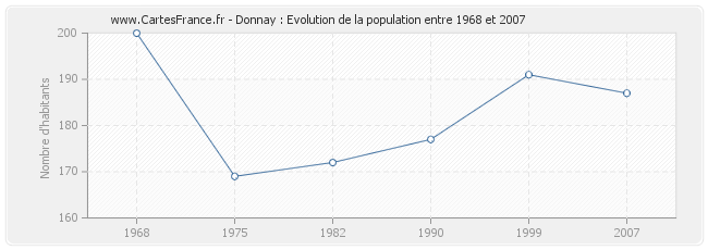 La population de Donnay était de 187 habitants en 2007, 191 habitants en 1999, 177 habitants en 1990, 172 habitants en 1982, 169 habitants en 1975 et 200 habitants en 1968.
