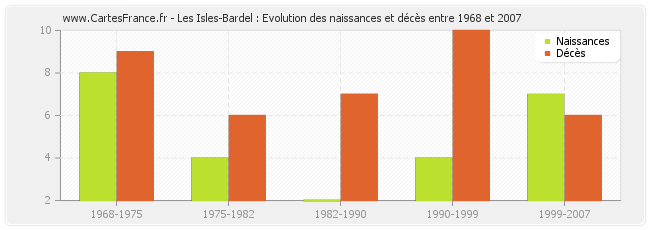 Les Isles-Bardel : évolution des naissances et décès de 1968 à 2007