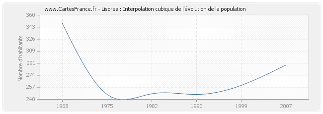 Cette courbe reprend l'historique de la population de Lisores de 1968 à 2007 en interpolation cubique. Ceci permet d'obtenir plus précisément la population de la commune de Lisores les années ou aucun recensement n'a été effectué.