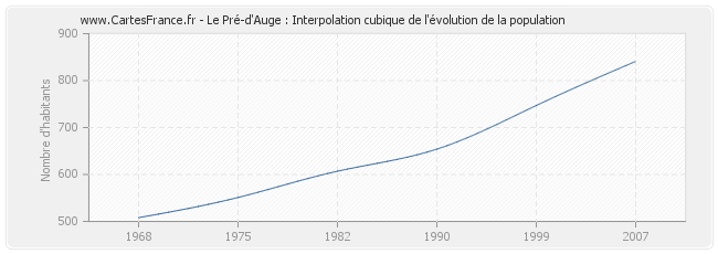 Cette courbe reprend l'historique de la population de Le Pré-d'Auge de 1968 à 2007 en interpolation cubique. Ceci permet d'obtenir plus précisément la population de la commune de Le Pré-d'Auge les années ou aucun recensement n'a été effectué.