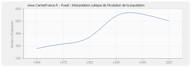 Cette courbe reprend l'historique de la population de Rosel de 1968 à 2007 en interpolation cubique. Ceci permet d'obtenir plus précisément la population de la commune de Rosel les années ou aucun recensement n'a été effectué.