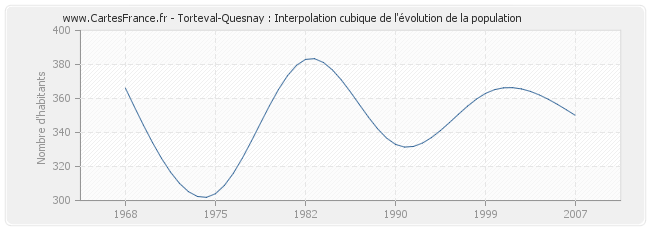 Cette courbe reprend l'historique de la population de Torteval-Quesnay de 1968 à 2007 en interpolation cubique. Ceci permet d'obtenir plus précisément la population de la commune de Torteval-Quesnay les années ou aucun recensement n'a été effectué.