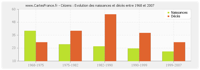 Cézens : évolution des naissances et décès de 1968 à 2007