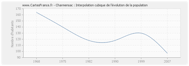 Cette courbe reprend l'historique de la population de Charmensac de 1968 à 2007 en interpolation cubique. Ceci permet d'obtenir plus précisément la population de la commune de Charmensac les années ou aucun recensement n'a été effectué.