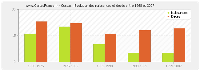 Cussac : évolution des naissances et décès de 1968 à 2007