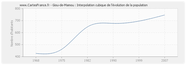 Cette courbe reprend l'historique de la population de Giou-de-Mamou de 1968 à 2007 en interpolation cubique. Ceci permet d'obtenir plus précisément la population de la commune de Giou-de-Mamou les années ou aucun recensement n'a été effectué.