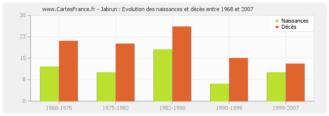 Jabrun : évolution des naissances et décès de 1968 à 2007