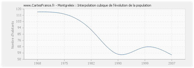 Cette courbe reprend l'historique de la population de Montgreleix de 1968 à 2007 en interpolation cubique. Ceci permet d'obtenir plus précisément la population de la commune de Montgreleix les années ou aucun recensement n'a été effectué.